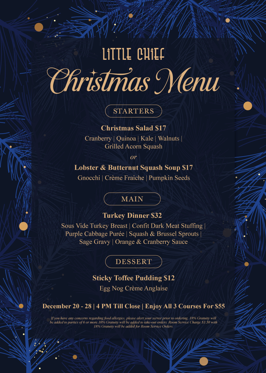 Savour the season with Little Chief’s Christmas Menu, featuring festive starters like a vibrant Christmas Salad or rich Lobster & Butternut Squash Soup, followed by a beautifully crafted Turkey Dinner with sous vide turkey breast, confit dark meat stuffing, seasonal vegetables, and citrus-bright cranberry sauce. Finish with a decadent Sticky Toffee Pudding topped with eggnog crème anglaise. Available December 20–28 from 4 PM to close, guests can enjoy all three courses for $55.
