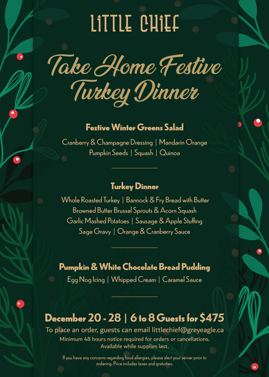 Enjoy the holidays at home with Little Chief’s Take Home Festive Turkey Dinner, featuring a gourmet winter greens salad, a full traditional turkey feast with bannock, seasonal vegetables, mashed potatoes, stuffing, sage gravy, and cranberry-orange sauce, plus a decadent pumpkin and white chocolate bread pudding for dessert! Available from December 20th-28th for $475. Good for 6 to 8 guests. Email littlechief@greyeagle.ca to place your order.