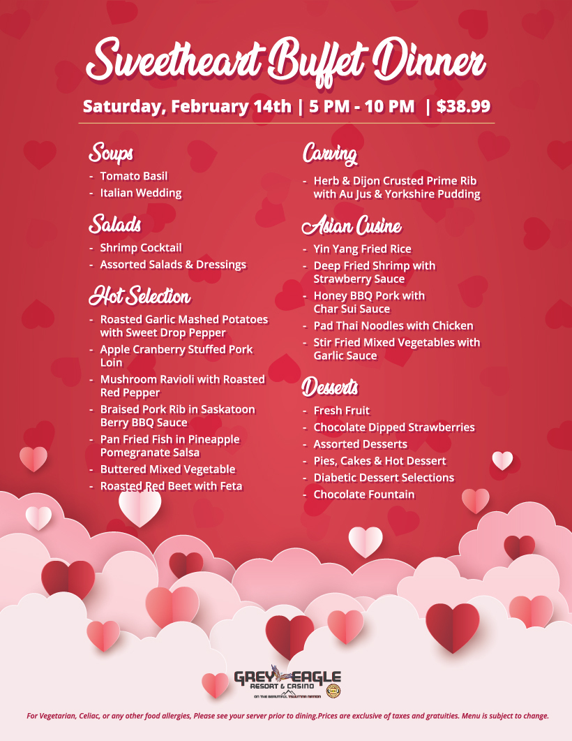 On Valentine’s Day, treat your loved one with a romantic Sweetheart Buffet Dinner at Grey Eagle Resort & Casino’s Buffet Restaurant. Available Saturday, February 14 from 5 PM to 10 PM, this special evening features an indulgent spread including prime rib carving with au jus and Yorkshire pudding, global Asian-inspired favourites, hearty hot entrées, fresh salads, and a decadent dessert selection complete with chocolate-dipped strawberries and a chocolate fountain. Priced at $38.99, it’s the perfect way to share a memorable evening together.